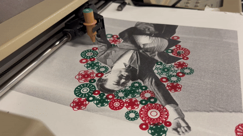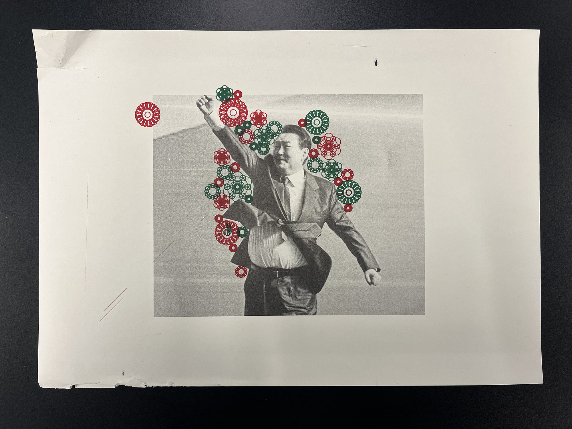 here i ended up drawing a bunch of flower-looking patterns made of circles around the recipient's silhouette, partly because with my lack of HP-GL and python knowledge, drawing bunch of circles was (and still kinda is) the easiest thing i could do. and i justified it by turning them into flower pattern, since flowers are a big reoccuring motif in shamanic performance/practice that i'm familiar with back home.